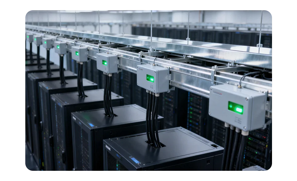 Embeds monitoring and data acquisition capabilities within the Feeder Box / Tap-off Box / Main Control Box structure, achieving end-to-end digitization of the busway system. It unifies the collection of main trunk electrical parameters, branch circuit energy consumption, equipment health diagnostics, and anomaly alarms, sending data up to DCIM/BMS. This supports high-density cabinets and rapid capacity expansion.
